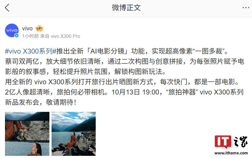 IT之家 9 月 28 日消息,vivo 官方今日宣布,vivo X300 系列手机推出全新「AI 电影分镜」功能中祥配资,可实现超高像素“一图多裁”。