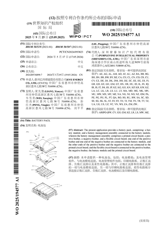 证券之星消息,根据企查查数据显示亿纬锂能(300014)公布了一项国际专利申请,专利名为“电池包”,专利申请号为PCT/CN2024/093823,国际公布日为2025年9月25日。